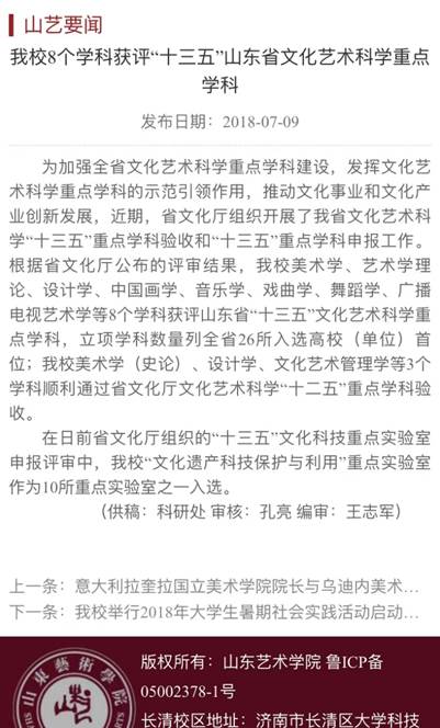 为加强全省文化艺术科学重点学科建设,发挥文化艺术科学重点学科的示范引领作用,推动文化事业和文化产业创新发展,近期,省文化厅组织开展了我省文化艺术科学“十三五”重点学科验收和“十三五”重点学科申报工作。根据省文化厅公布的评审结果,我校美术学、艺术学理论、设计学、中国画学、音乐学、戏曲学、舞蹈学、广播电视艺术学等8个学科获评山东省“十三五”文化艺术科学重点学科,立项学科数量列全省26所入选高校(单位)首位;我校美术学(史论)、设计学、文化艺术管理学等3个学科顺利通过省文化厅文化艺术科学“十二五”重点学科验收。