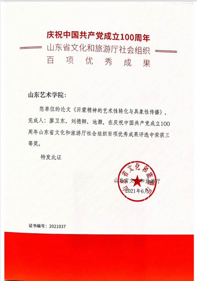 廖卫东论文《沂蒙精神的艺术性转化与具象性传播》在庆祝中国共产党成立100周年山东省文化和旅游厅社会组织百项优秀成果评选中荣获三等奖