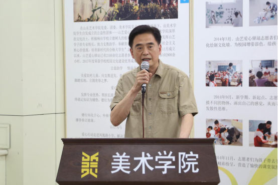 美术学院党总支书记常勇教授在开幕式上讲话,他强调,山艺爱心驿站是在学校领导的大力支持和悉心关怀下,由美术学院学生自发成立的公益性团体,以“高举团旗跟党走,弘扬时代精神,感恩回报社会,倡树文明新风”为导向,秉承“奉献、友爱、互助、进步”的志愿者精神,充分发挥山艺学子的专业特长,积极开展“践行社会主义核心价值观,培育新时代的合格大学生”志愿服务活动。自2013年11月成立以来,支教足迹已遍布长清区龙湾小学、丹凤小学、孙庄小学、凤凰路小学、山东师范大学大学城实验学校(小学部)五所学校。每周定期支教之余,山艺爱心驿站还积极开展和引导志愿者们参与丰富多彩的公益活动,走进福利院、敬老院、特殊教育学校,举办公益献血、义务墙绘、义卖明信片、感恩阿姨节、爱心衣物募捐、送春联福字、“三下乡”寒暑假社会实践等,前后参与志愿者多达2100余人,累计服务102900余小时。爱心驿站的事迹先后被中央人民广播电台、中国青年报、山东教育电视台、济南教育电视台、齐鲁晚报、央视网、人民网、新华网等多家媒体报道。他希望通过本次成果展勉励山艺爱心驿站的志愿者们持之以恒地担当和付出,用爱圆梦,用心筑梦,以更加坚强有力的步伐迎未来。