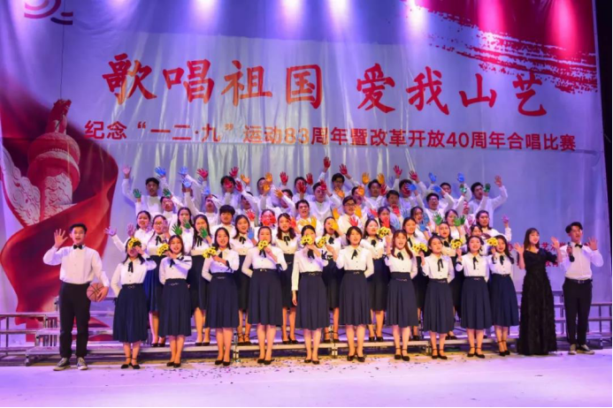 演唱《太行山上》时,美院学子用磅礴的歌声表达对伟大祖国的热爱和对先辈们的敬仰,并且饱含深情地献礼对联“山艺人乘风扬帆,六十载春华秋实”,字字句句中传达着美院学子作为山艺人的骄傲和对山艺的热爱。