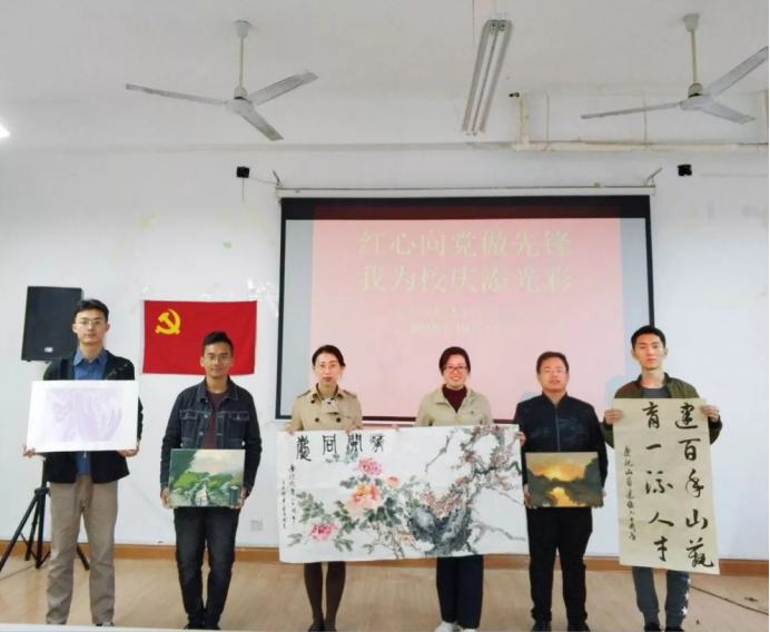 2018年10月17日13:00点,美术学院本科生党支部在教学楼c204举行“红心向党做先锋,我为校庆添光彩”的主题党日活动。“六十年栉风沐雨,一甲子春华秋实”,在山东艺术学院建校60周年之际,美术学院本科生党支部学生党员发挥专业优势,创作了一幅幅主题鲜明的艺术作品,油画、版画、中国画、书法等各具特色,以自己的专业来呈现学校的美景,向校庆献礼。