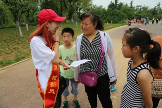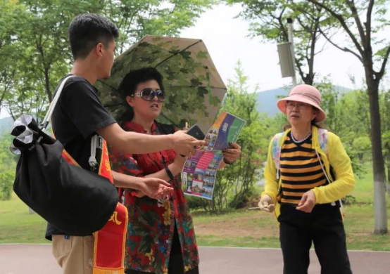 另一组同学在景区内向游客发放并仔细讲解《文明旅游倡议书》与《济南国际园博园旅游指南》,提高游客对“文明旅游”的了解,进一步增强文明旅游的意识,文明志愿精神得到了游客们的认可与赞许。