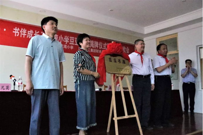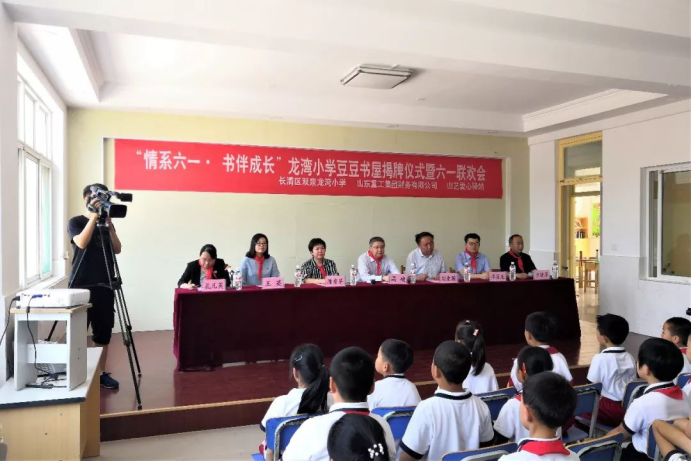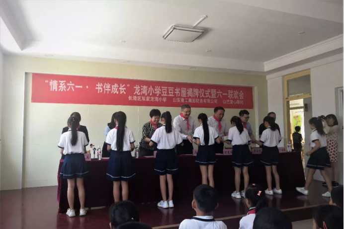 5月30日下午,美术学院与山东重工集团财务有限公司共建的“情系六一·书伴成长”龙湾小学豆豆书屋揭牌仪式在长清区龙湾小学举行。山东重工集团财务有限公司党支部委员、工会主席高峻,美术学院党总支副书记陈秀芹,长清区教育和体育局副局长刘爱国,山东重工集团财务有限公司共青团书记李海龙,美术学院团总支书记王英,长清区双泉镇党委委员、副镇长孔凡英,长清区双泉镇教育办主任方绪强出席揭牌仪式。仪式由长清区双泉镇党委委员、副镇长孔凡英主持。