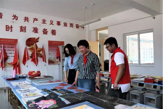 仪式最后,与会领导共同为龙湾小学“豆豆书屋”揭牌,并集体参观了豆豆书屋的建设情况,与孩子们一块翻阅图书。美术学院师生还一起参观了龙湾小学专门为山艺爱心驿站支教成果设立的成果展示室。