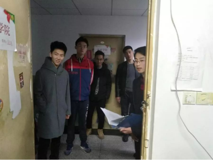 党员冯德昌、王升旭、贾智硕、尹一鸣检查1号男生公寓