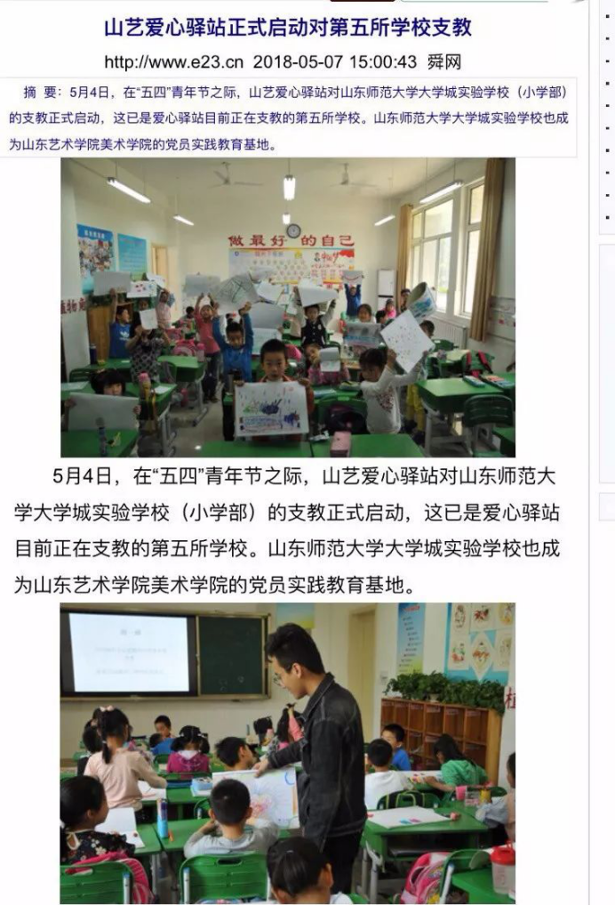 5月4日,在“五四”青年节之际,山东艺术学院美术学院党员实践教育基地在山东师范大学大学城实验学校(小学部)正式建立,同时山东师范大学大学城实验学校(小学部)也是山艺爱心驿站目前正在支教的第五所学校。