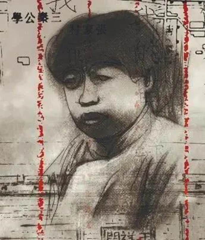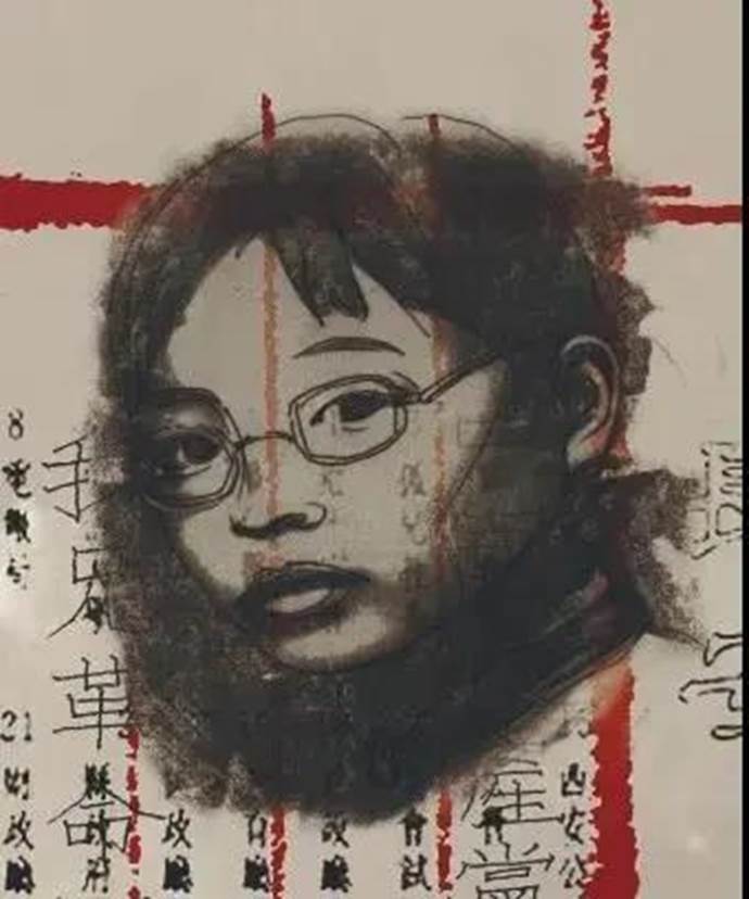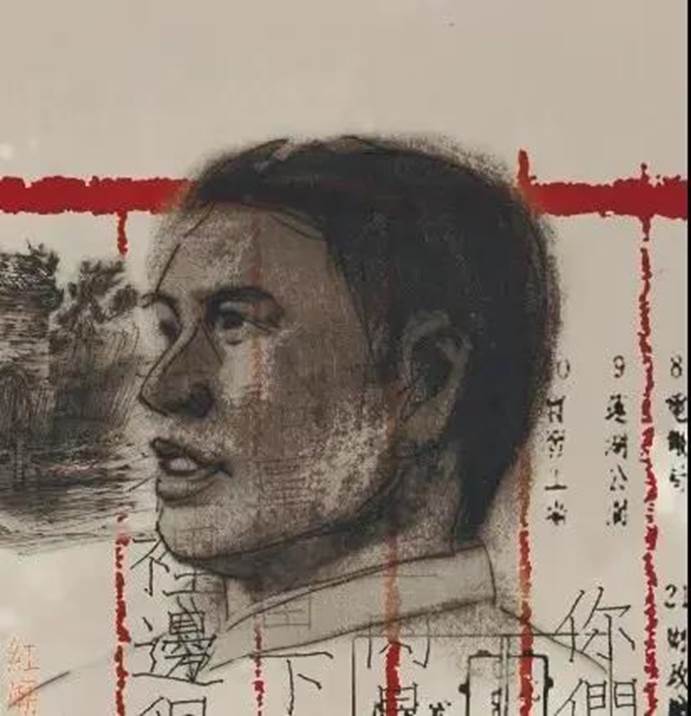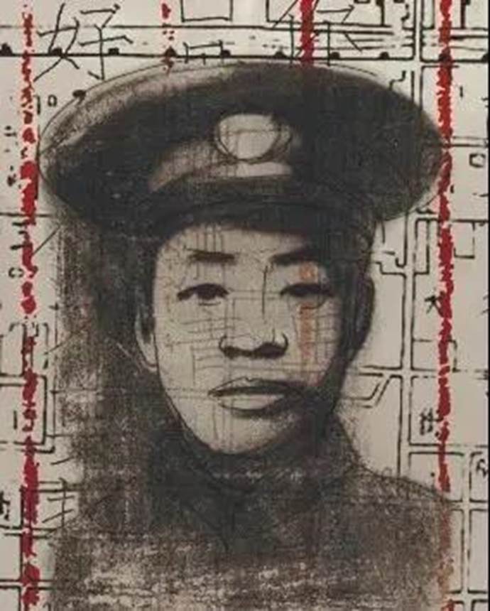 《悲壮西安九烈士》这幅作品采用丝网版画的形式,画面中心选取西安九烈士的头像均匀排布,形象的真实性和丝网版画独特的表现魅力交织在一起,映衬出庄严的史实。泛黄的色彩基调凸显出九位烈士的崇高气节。底部以西安城门为背景,城门外人群涌动,进步青年正振臂抗议,作者借鉴了蒙太奇剪辑手法,深入挖掘典型,取得了肖像性和情节性之间的平衡,侧面反映出九位烈士面临残酷折磨时不畏牺牲的大无畏精神。
