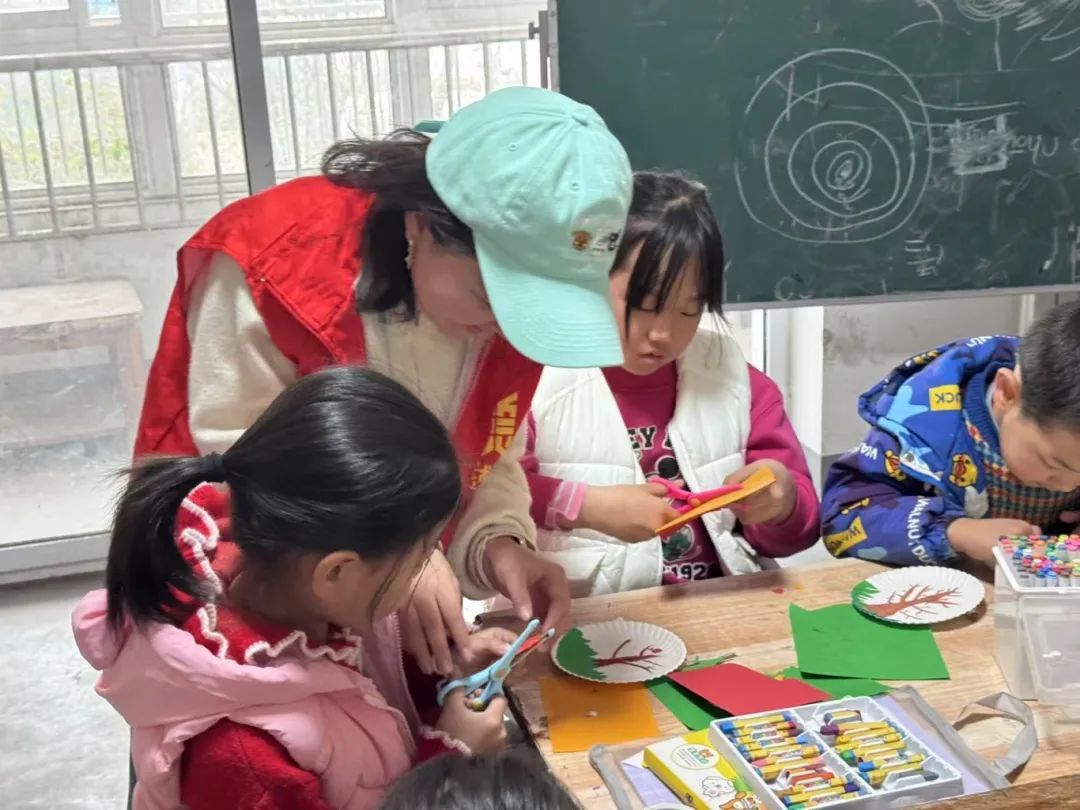 植树节当天,志愿者们以环保为主题,带领孩子们用纸盘、彩纸制作“心中的小树”。孩子们一边创作,一边聆听志愿者讲解绿色生活的意义。植树节的环保课堂变身创意工坊。当废旧纸盘“长”出葱郁树冠,孩子们恍然大悟:“原来艺术可以让垃圾重获新生!”这堂生动的生态美育课,种下的不仅是创意,更是可持续发展的未来。这场融合美育与生态教育的课堂,正是“‘丹青’领航”的生动实践—用艺术传递责任。