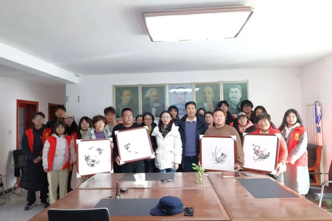师生将亲手绘制的《梅》《兰》《竹》《菊》四幅国画作品、象征新年美好寓意的福字和春联、特色年画赠予了小崮山社区。
