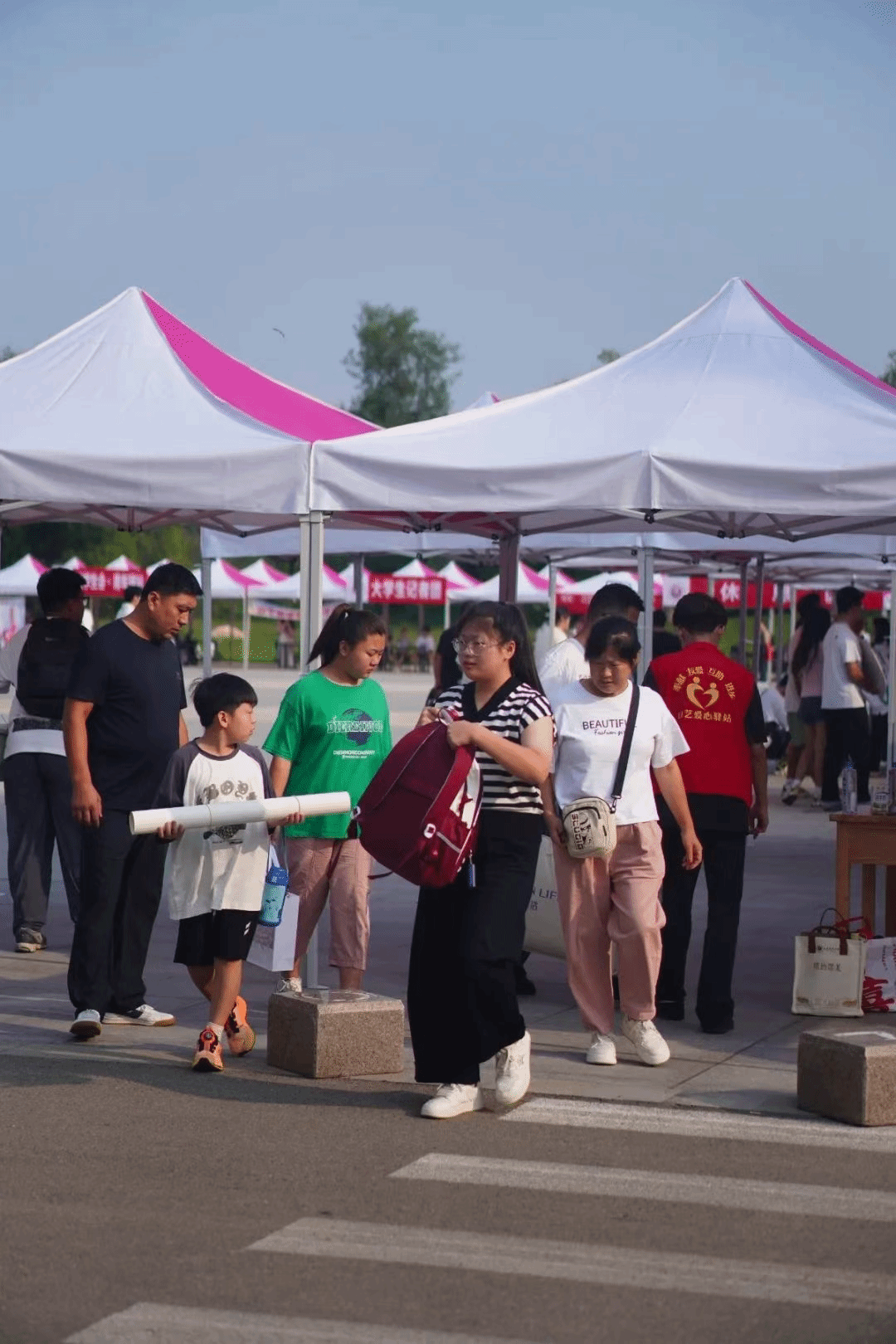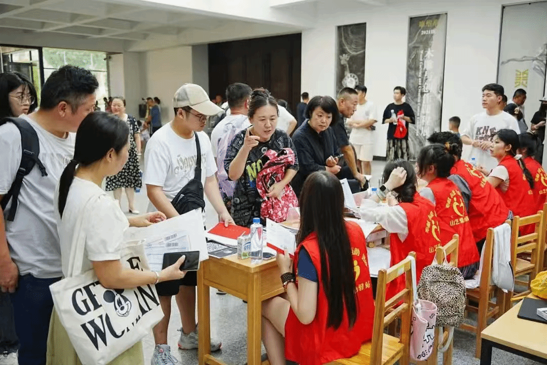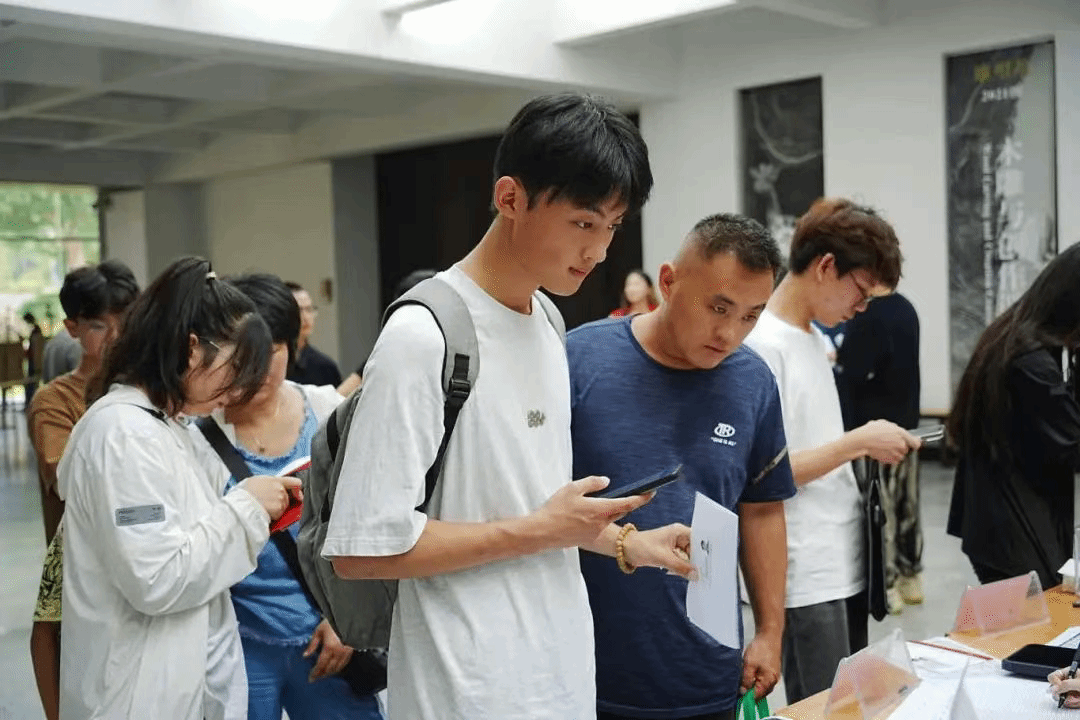 迎新现场,热闹非凡。迎新志愿者将新生引导至美术学院内完成报到手续。志愿者们积极主动、耐心细致为新生及家长答疑解惑。