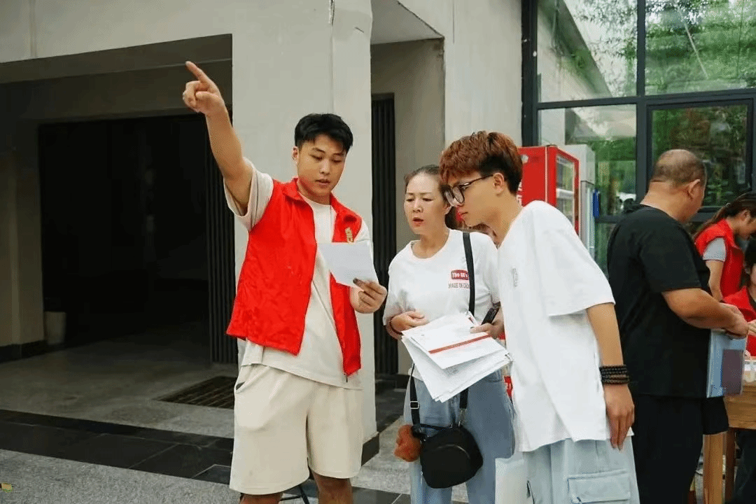 宿舍楼下,迎新志愿者们分工协作,帮助新生搬拿行李。天气炎热,但大家的热情也丝毫未减,青春活力的氛围在空气中弥漫。