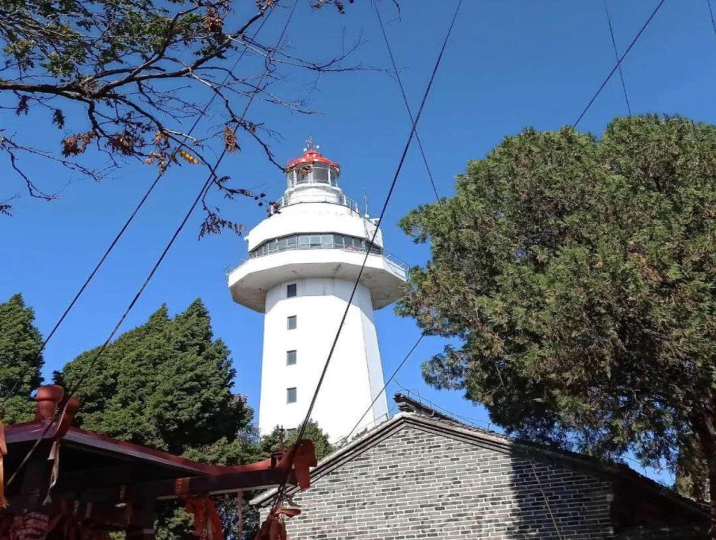 让我印象最深刻的还属烟台山的灯塔。不得不说,烟台的天气真的超级好。老师带我们来到了烟台山灯塔,这个灯塔是烟台市的标志性建筑,被誉为“烟台市标”和“黄海夜明珠”。在灯塔上可以看到老烟台市区全景,风景真的非常好看,天和海融为一体,蓝色真的太治愈了。我和豆豆宝贝拍了很多好看的照片,可以说是考察的意外收获了。