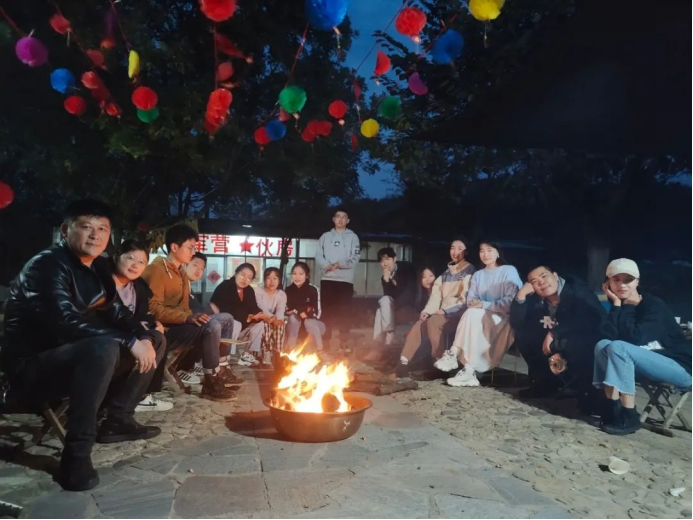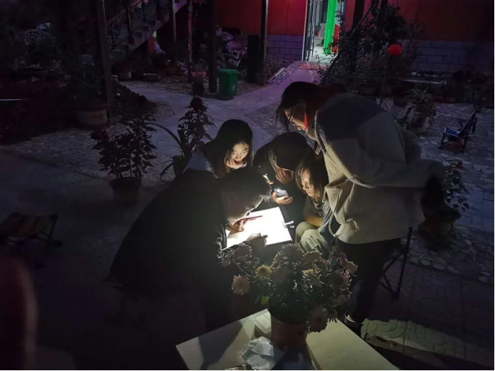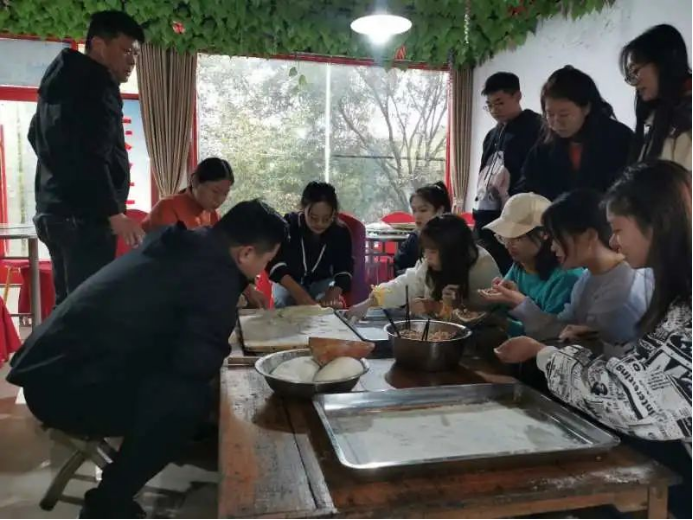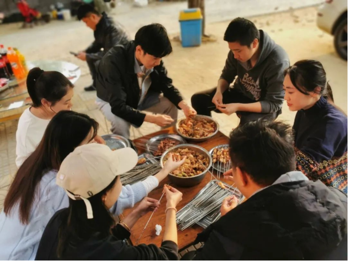 临近中午,这里的大姐热情的招待我们,满桌子的农家菜,我最喜欢她做的大盘鸡了,我们八个人一桌,饭前我们差不多轮着给其他人盛饭,分好筷子和碗,夹不到或不方便夹的,我们都会互相夹。我们还一起赶集,挤面包车,串肉,吃烧烤,包水饺,爬山,晚上一起消食散步,相互吓唬、打闹。从刚分工作室的不太熟,到现在的一家人。