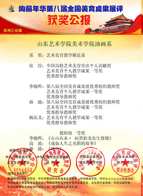 近日,在第八届全国美育成果展中,美术学院喜获佳绩。张淳院长获全国高校艺术美育突出个人贡献奖、艺术美育个人教学成果一等奖、优秀指导教师奖。油画系李晓辉主任获优秀组织教师奖、艺术美育个人教学成果一等奖、优秀指导教师奖。壁画系孙逊主任获优秀组织教师奖、艺术美育个人教学成果一等奖。杨庆义教授获艺术美育个人教学成果一等奖、优秀指导教师奖。油画系还获得“艺术美育教学模范系”的荣誉称号。