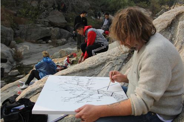 11日下山后,每位艺术家都积极的投入到创作中,将自己对这个城市的独特感知呈现于画面上。奥古斯托;帕切科,他被中国式的建筑所深深吸引,给予了极高的评价。在他的画面上,制作性强的直线无不体现出德国文化与中国文化的结合。罗尼;李申斯基,他对泰安的印象可以说是细腻的,透过油画的肌理质感,以及层层的覆盖,透露出了他对中国的初步印象。翁德雷;德雷舍,他画面呈现的效果可以说是相对写实的,对景象进行主观处理,用粗细不一的线条来组织整个画面,虽看上去清新淡雅,但却不失整个画面的节奏感。马蒂亚斯;多伊奇,他对中国的古树可以说是情有独钟,用线条当做绘画语言,运用中国画材中最古老的勾线笔、墨水作为材料,勾勒出攀枝错节的曲线,体现古树极强的生命张力。在艾娃;施瓦布的作品上,泰山的雾海透过麻布所浸湿的画布得以表达,异常的飘渺、清逸、俊秀。卡特琳;海歇尔;维塔,画布上那层层底色,那一层又一层的覆盖,使泰山看起来总是多了几分神秘,耐人寻味。
