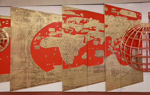 唐鸣岳教授为北京地铁六号线车公庄西站站厅,创作的壁画“面向世界——利玛窦之窗”,长27米,高3.25米,材料采用黄铜、合金铝、钢板,制作采用蚀刻、电解、浮雕、透雕、锻造和喷漆等手法完成。作品以稍许打开的“坤舆万国全图”和半掩的罗马式窗拱为框架,表现400多年前意大利传教使者利玛窦在中国的出现,推开了中国了解世界的一扇扇窗口,面朝海洋,光从空隙中透射进来,是利玛窦通过知识的沟通和传播,改变了一个王朝乃至整个中国对西方科学及文化的观念。