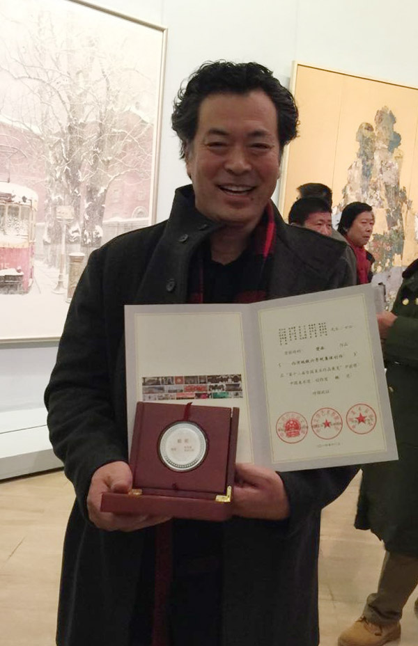 全国美展五年一届,集合各画种的大型美术作品展览,被称为“中国美术的奥运会”,其奖项的含金量也是最高的。唐鸣岳教授这次获奖,是他继“第十一届全国美术作品展览”《渔满堂》获得首届“中国美术奖·创作奖”优秀奖之后,又一次获得“中国美术奖·创作奖”的银奖,也是“第十二届全国美术作品展览”壁画中获得的最高奖项。