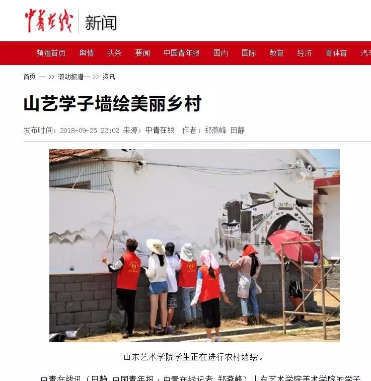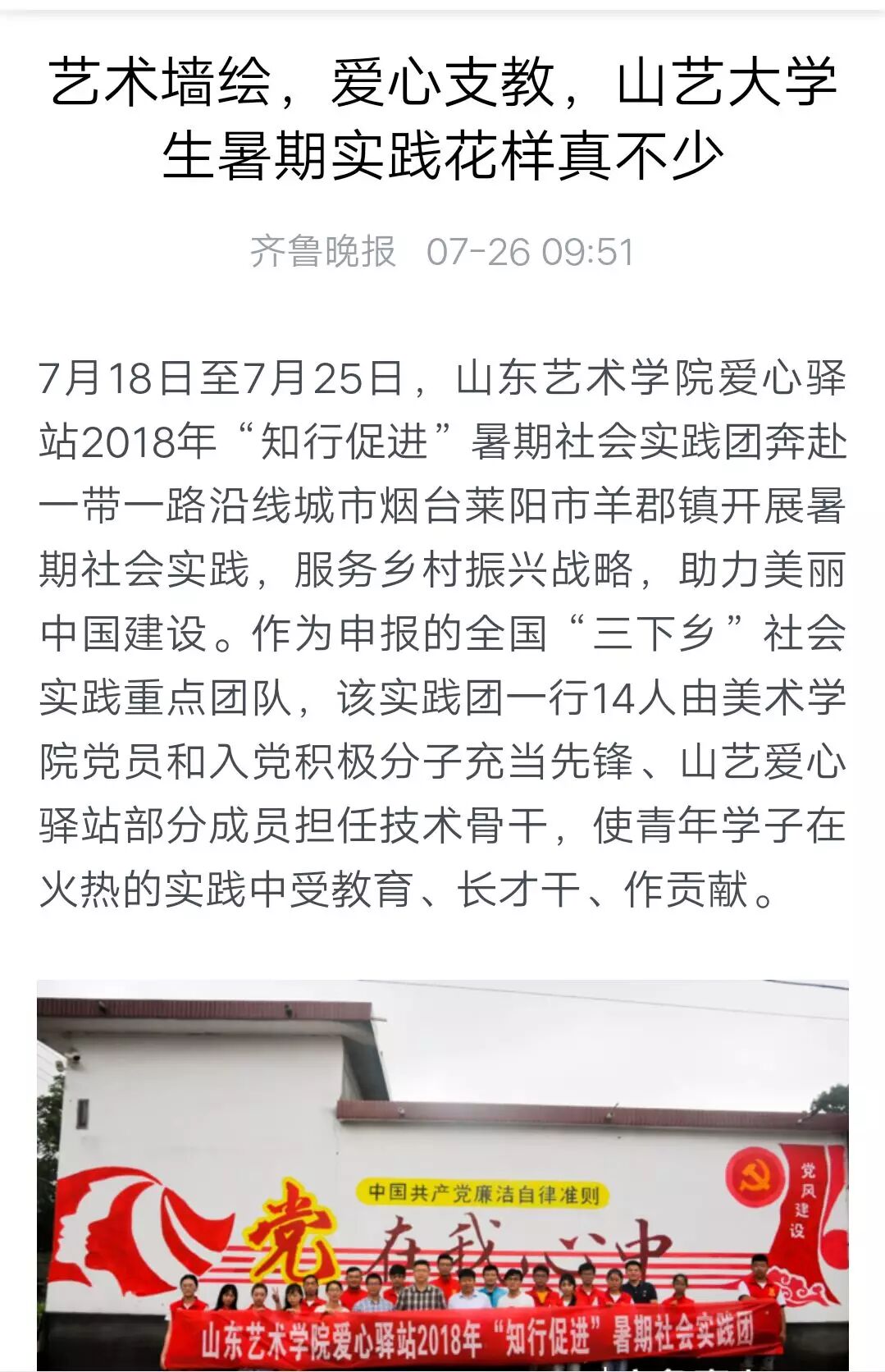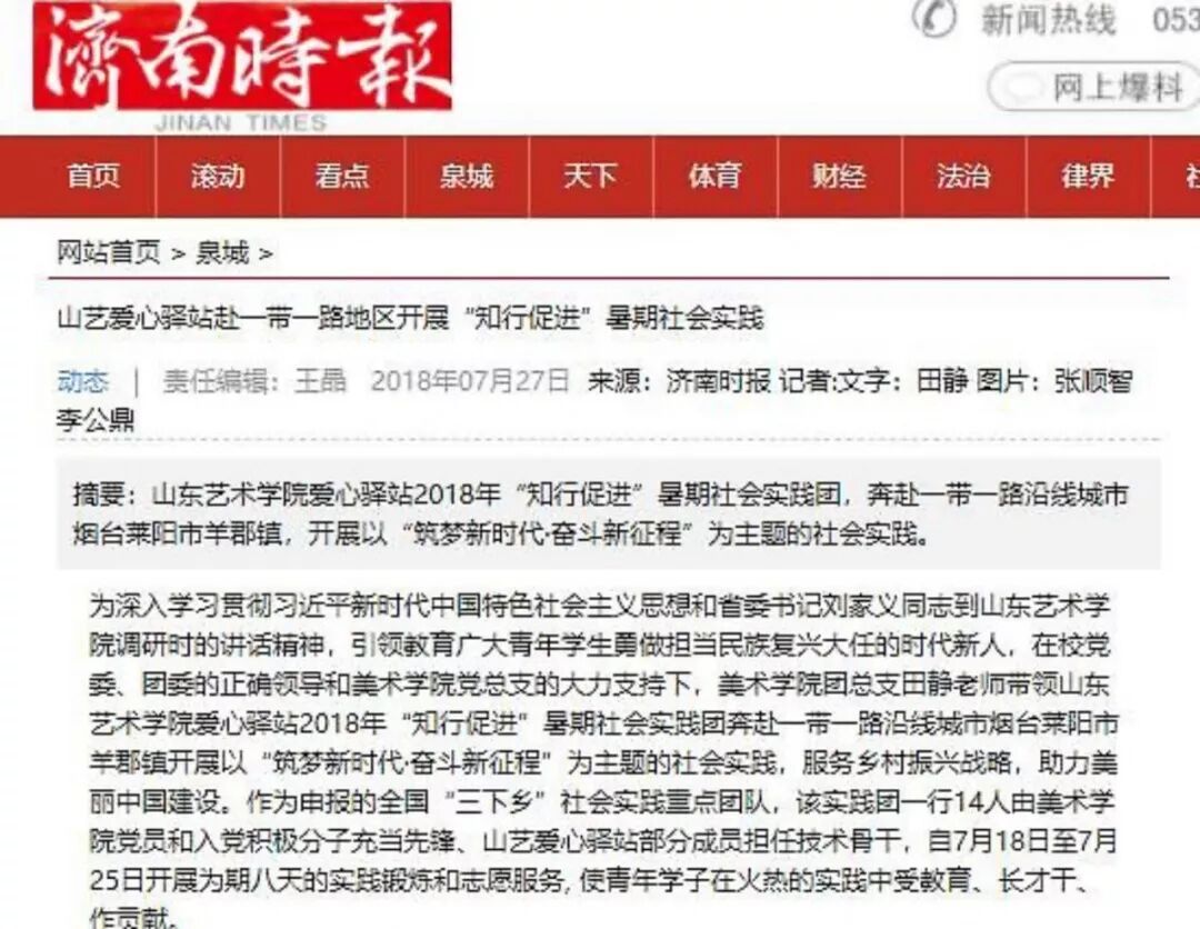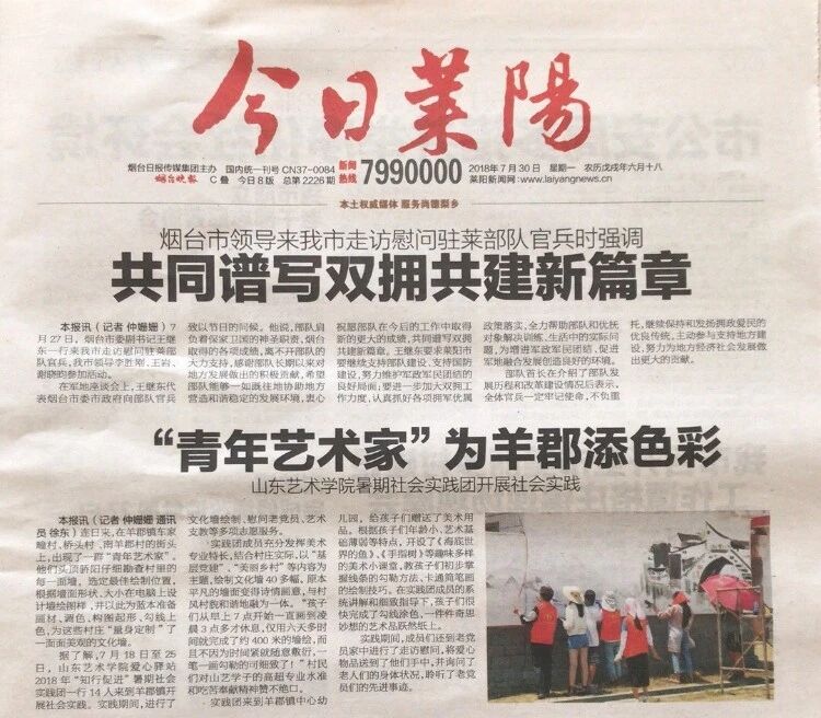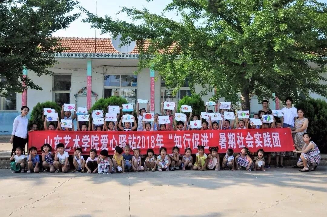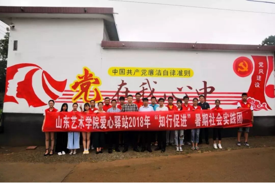 为深入学习贯彻习近平新时代中国特色社会主义思想主题教育,引领教育广大青年学生勇做担当民族复兴大任的时代新人,在校党委、团委的正确领导和美术学院党总支的大力支持下,美术学院团总支田静老师带领山东艺术学院爱心驿站2018年“知行促进”暑期社会实践团奔赴一带一路沿线城市烟台莱阳市羊郡镇开展以“筑梦新时代·奋斗新征程”为主题的社会实践,服务乡村振兴战略,助力美丽中国建设。作为申报的全国“三下乡”社会实践重点团队,该实践团一行14人由美术学院党员和入党积极分子充当先锋、山艺爱心驿站部分成员担任技术骨干,自7月18日至7月25日开展为期八天的实践锻炼和志愿服务, 使青年学子在火热的实践中受教育、长才干、作贡献。