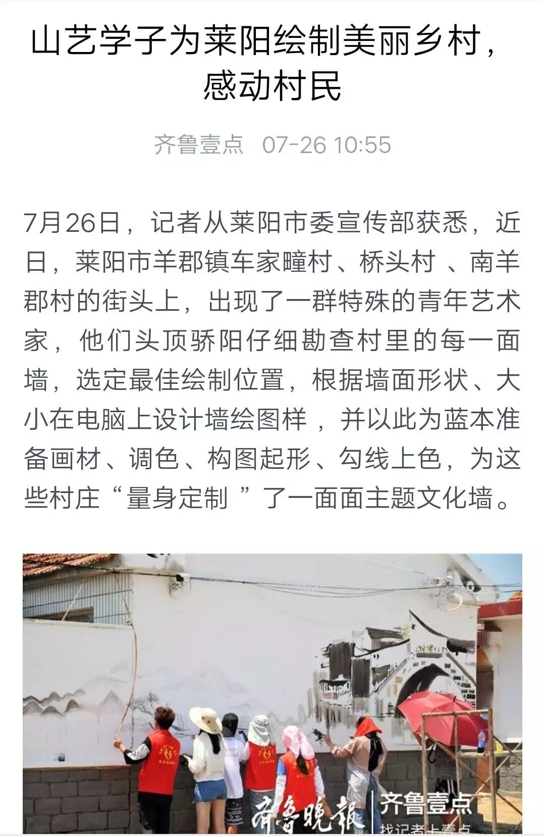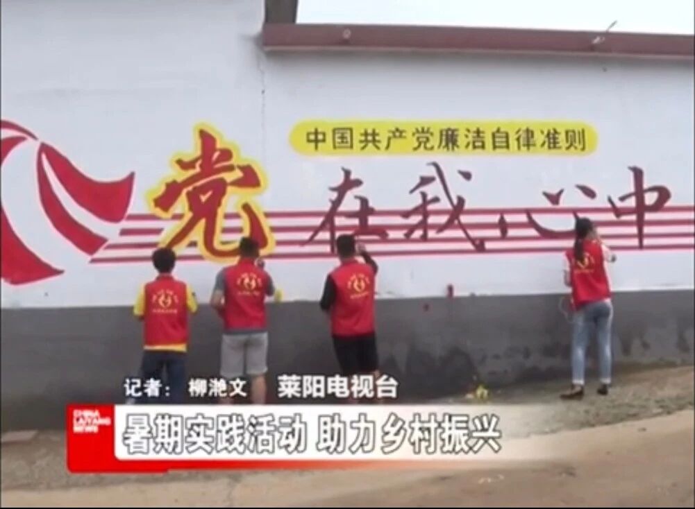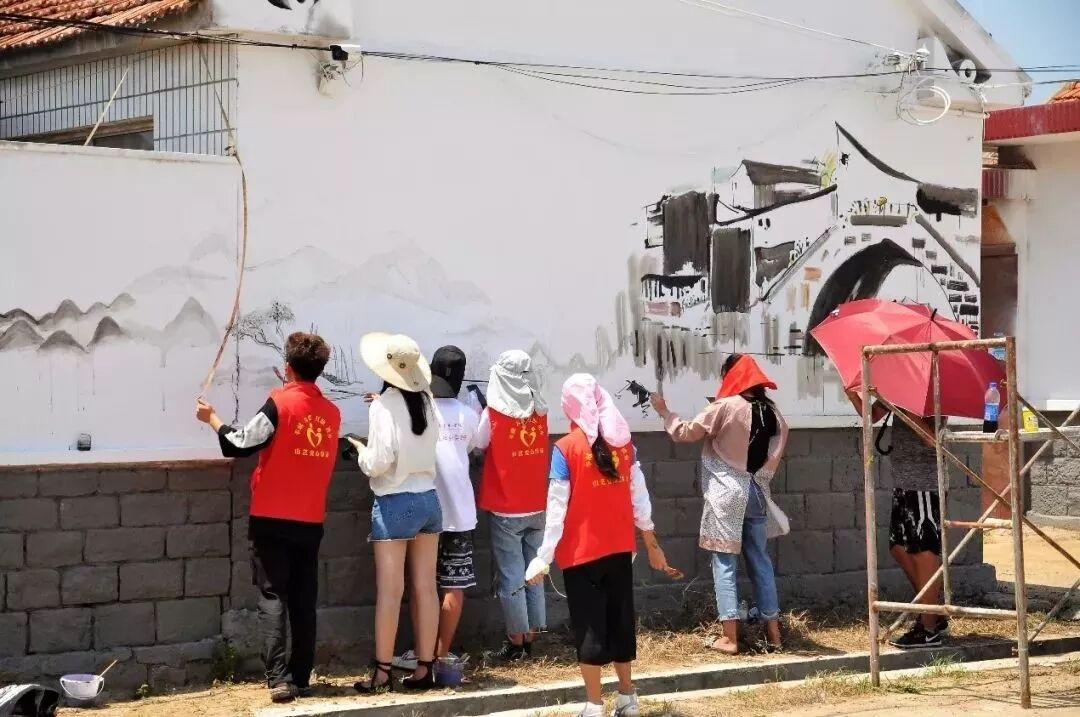 知行促进”实践团充分发挥美术学院的专业优势,结合羊郡镇车家疃村、桥头村、南羊郡的实情,以“基层党建、美丽乡村”为主题,绘制了贴近村民生活的主题文化墙。似火骄阳没有阻挡该实践团成员志愿服务的热情,他们仔细勘察村里的每一面墙,选定最佳绘制位置,丈量墙体面积,根据墙面形状、大小在电脑上设计墙绘图样,以此为蓝本准备画材、调色、构图起形、勾线上色。他们从早上7点一直奋战到凌晨3点多才休息,每天工作近18个小时,仅用六天多时间就完成了约400米的墙绘。每一步都经过严格筛选,每一处都精雕细琢,经过大家的共同努力,原本突兀的墙面变得诗情画意,俨然正在打开的美丽乡村画卷,与村风村貌有机地融为一体。羊郡镇委镇政府、村两委及围观村民对山艺学子的高超专业水准和吃苦奉献精神赞不绝口。主题鲜明、栩栩如生的墙绘作品为美丽乡村奉上了一道文化盛宴,使村民们领略到了艺术的魅力,通过实践活动,同学们在服务社会的过程中提高了专业技能,磨练了意志品质,实现了自我成长。