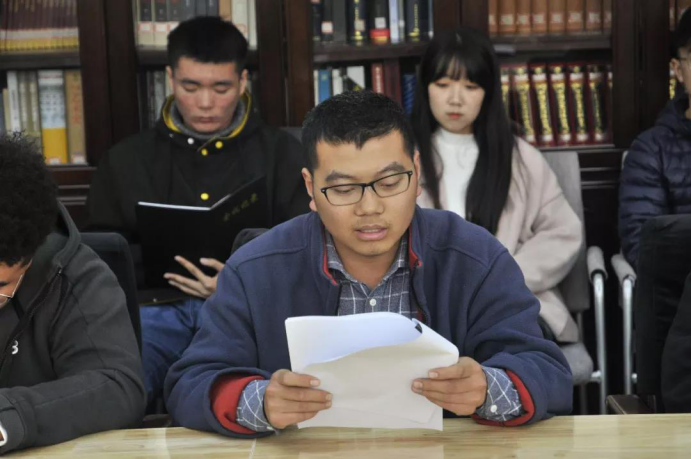 第一环节,由青习社社长孔繁昌带领大家全文学习党的十九届四中全会公报,通过逐句逐字的学习,让青年学生准确把握会议内容,深入体会会议精神,牢固树立制度自信,自觉尊崇、维护中国特色社会主义制度。