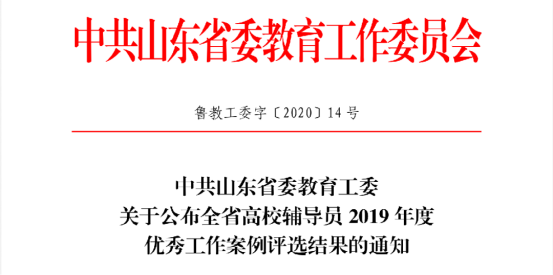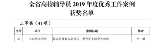 近日,中共山东省委教育工委公布了全省高校辅导员2019年度优秀工作案例评选结果,并对获奖人员进行通报表彰。我院辅导员李健老师撰写的案例《探索党建育人新模式,提升党支部育人效能》获得三等奖。