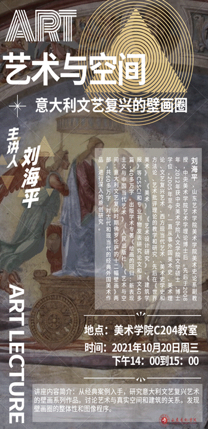 10月20日下午,山东艺术学院美术学院美术史论系副教授刘海平老师,在美术学院C204教室,开展了题为《艺术的空间——意大利文艺复兴艺术的壁画圈》的讲座。