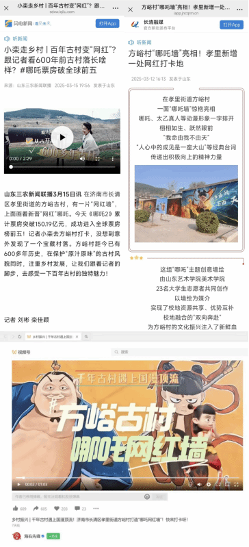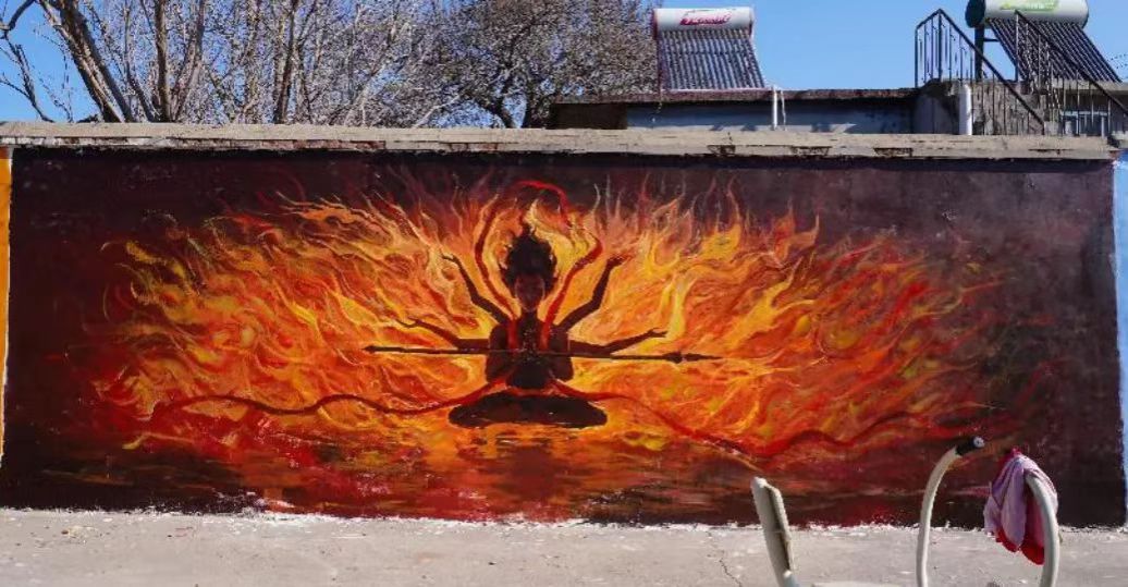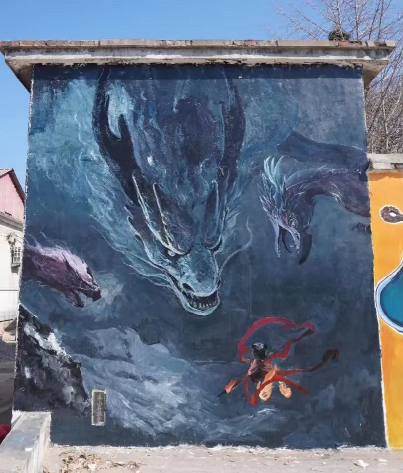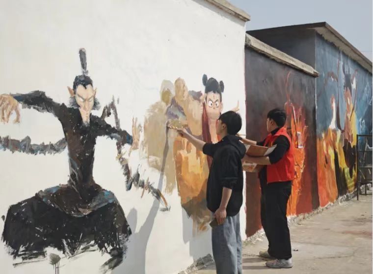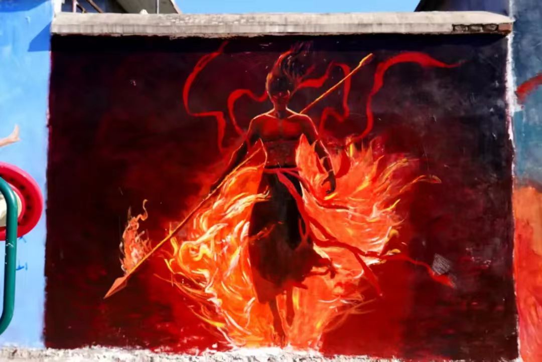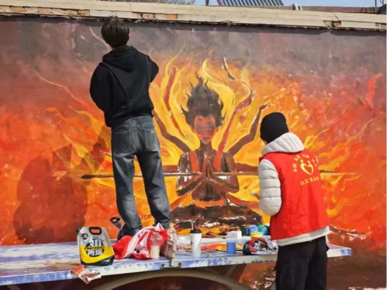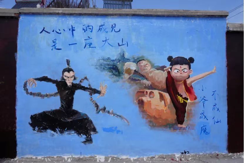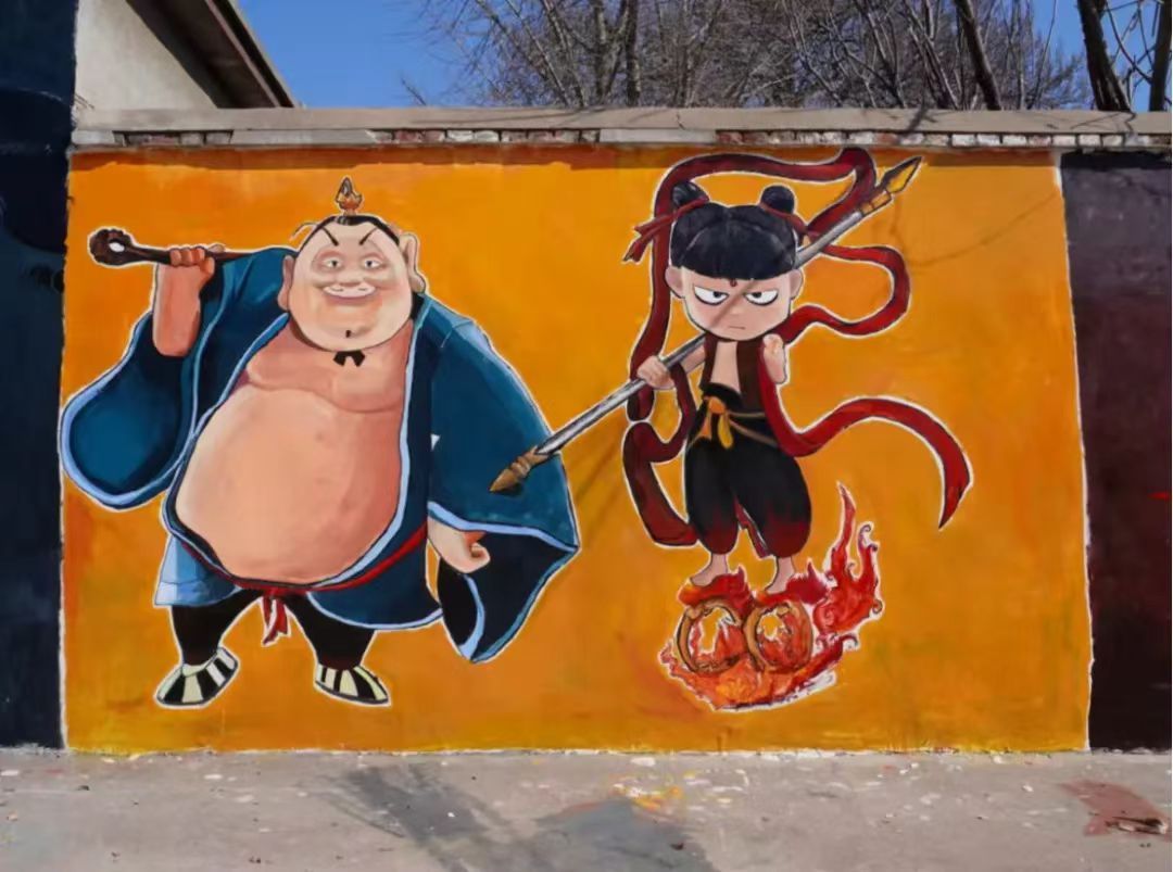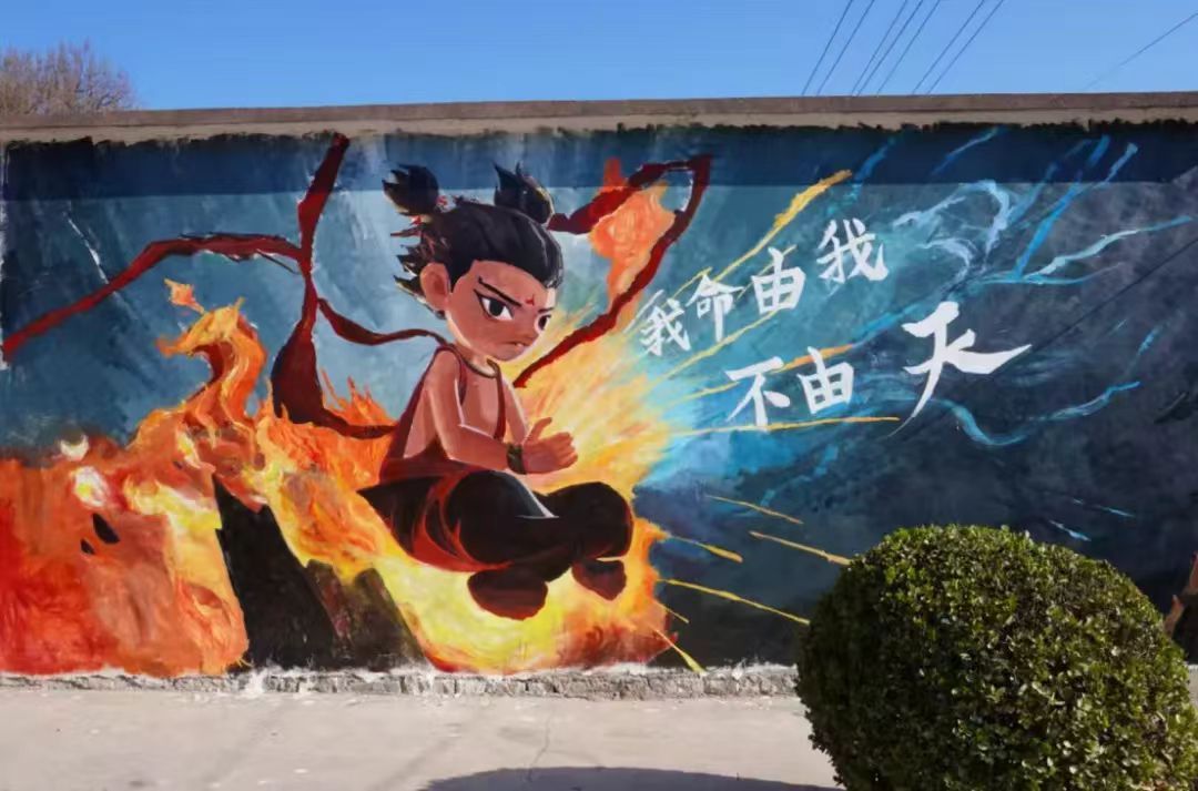 方峪村历史悠久,文化底蕴深厚。同学们通过勾勒人物动态线稿、分层起形、渐变上色等工序,绘制了6幅《哪吒》主题墙绘。同学们将传统神话IP与当代国潮画风结合,采用全景式构图的手法,在保留传统元素基础上融入电影细节,形成了古村肌理与现代美学的视觉对话。