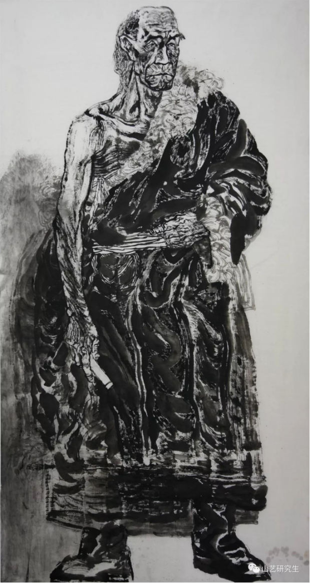 中国画的“笔墨”观,体现在一个画家多年来对毛笔、宣纸及水墨的驾驭之中。综观中国绘画史,每一次进步都与笔墨形态认识观念的更新、绘画材料的变革有着直接的关系。中国水墨意笔画基本形态是靠笔墨结构组合而成的。水墨画的形态构成依赖于笔墨,这是形态构成特征的基本属性。水墨写意人物画的难度在于材料特性所产生的笔墨的随机性和书法用笔的审美规范所引发的书写性,正因为书法用笔的单纯性和抽象性,强调了行笔、运腕、走线、吐气等一系列技艺方面的高度协调,在控制与放纵中形成了笔态随意态、随机缘不断生发与演义的过程,从而形成了毛笔在宣纸上连续不断富有审美趣味节奏感的律动。这一过程在水墨人物画中的体现,再加之人物造型的制约,无疑反映出水墨人物画所具有的独特的操作规范,同时这也是它的风格和魅力所在。正因为它如人之性情而变化着、生动着,所以我执迷于这种制约中求挥洒的游戏,它反映着我所观、所觉、所思、所爱,从中体验着一种理念与行为感知达到和谐时的自由,这时各种有趣的、美妙的面容从画面中微笑着靠近我、拥抱我、陶醉我……